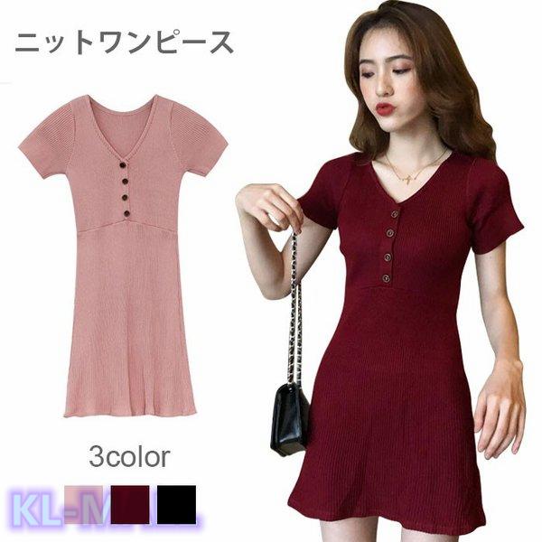 サマーニット レディース ニットワンピース Kl ワンピース ミニワンピース 半袖 Vネック 無地ニット リブニット 薄手ニット スト Klsop Kl Mall 通販 Yahoo ショッピング