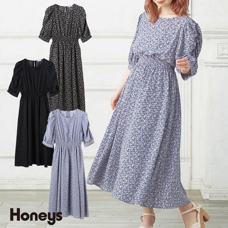 秋冬新作 ワンピース 5分袖 ロング丈 花柄 ドット ボリューム袖 おしゃれ レディース 夏 秋 Honeys ハニーズ パワショルワンピースの通販 価格比較のビカム